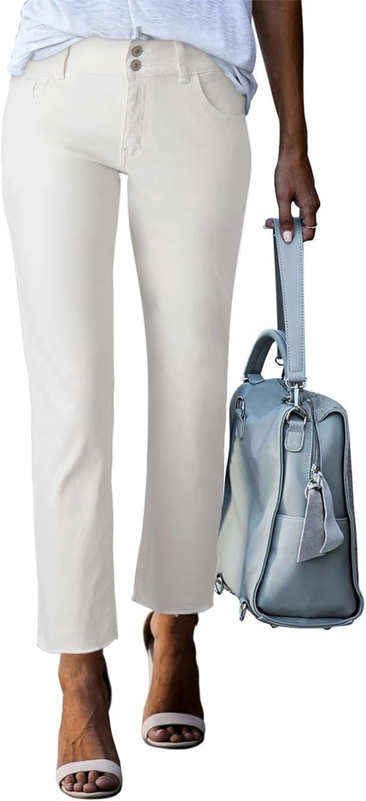 Women's High Waisted Jeans Strechy Raw Hem Straight Leg Denim Pants with Pockets